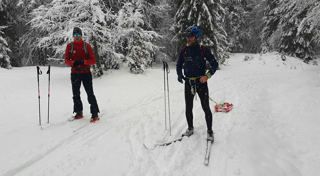 Gli sci con le pelli e gli sci da fondo scorrono che è un piacere nella costante ma non impegnativa ascesa. Le racchette di carbonio pressofuso di ultima generazione letteralmente si piegano sotto le spinte potenti del fondista dei MIB. Mettendo a dura prova la ritmata camminata di Cinci che ovviamente non ci sta a perdere neanche un metro.