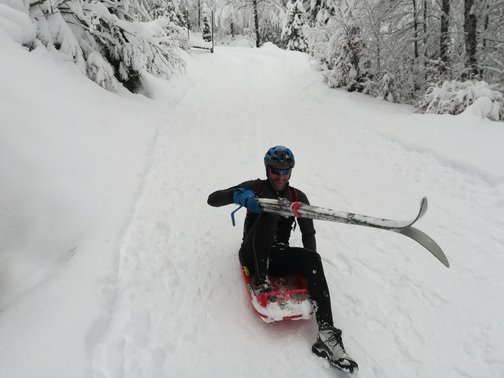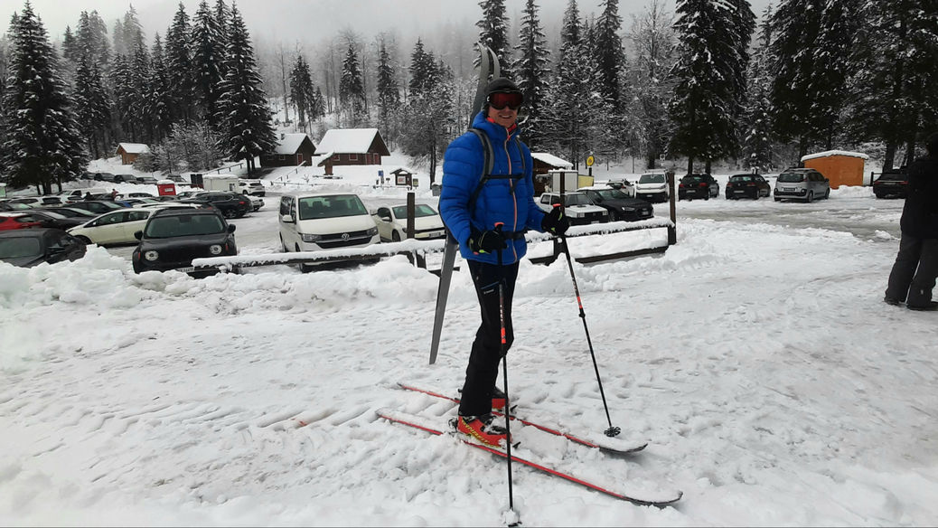 Cinci arriva al riempito parcheggio per primo, seguito da Icefoot con sci di ricambio ed infine da Bussola sempre più convinto di passare al e-bob.
