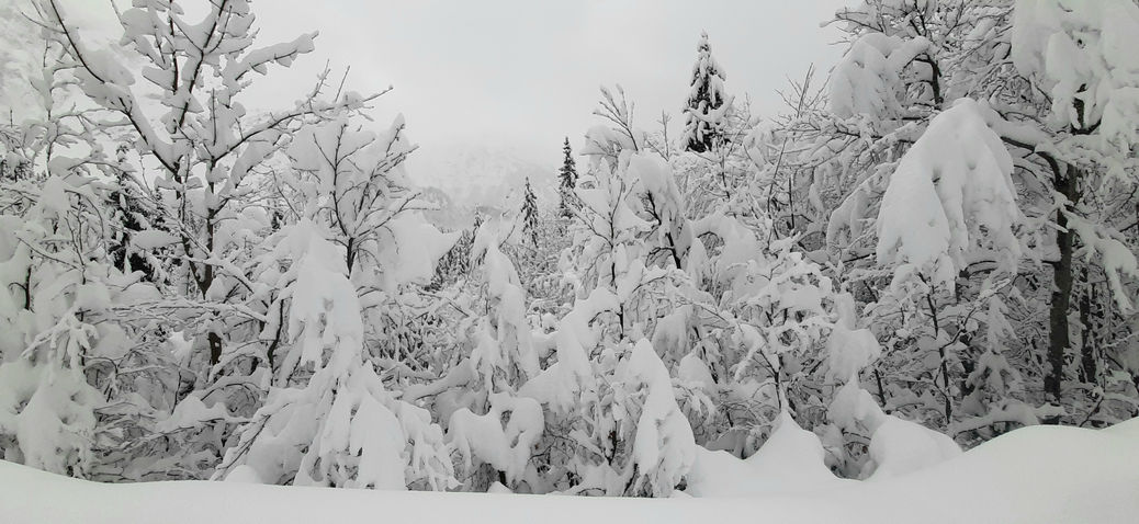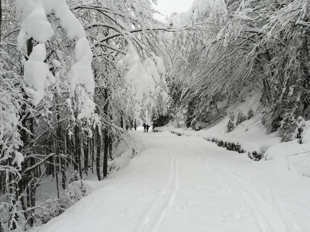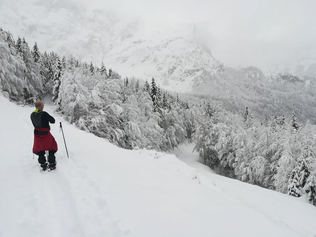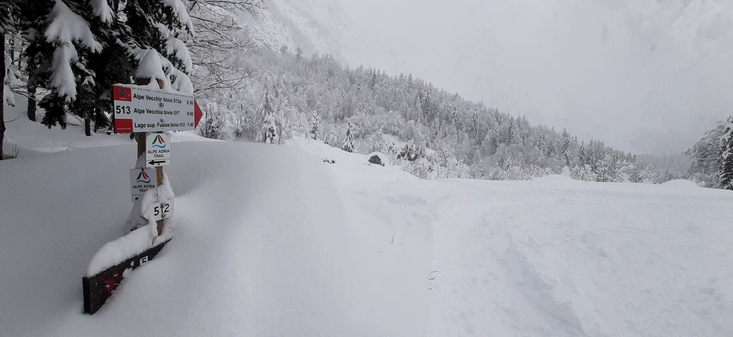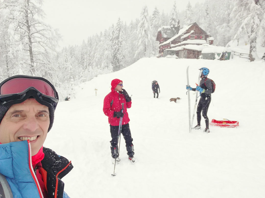 Una continua nevicata ci accompagna lungo i sei chilometri verso il rifugio.
